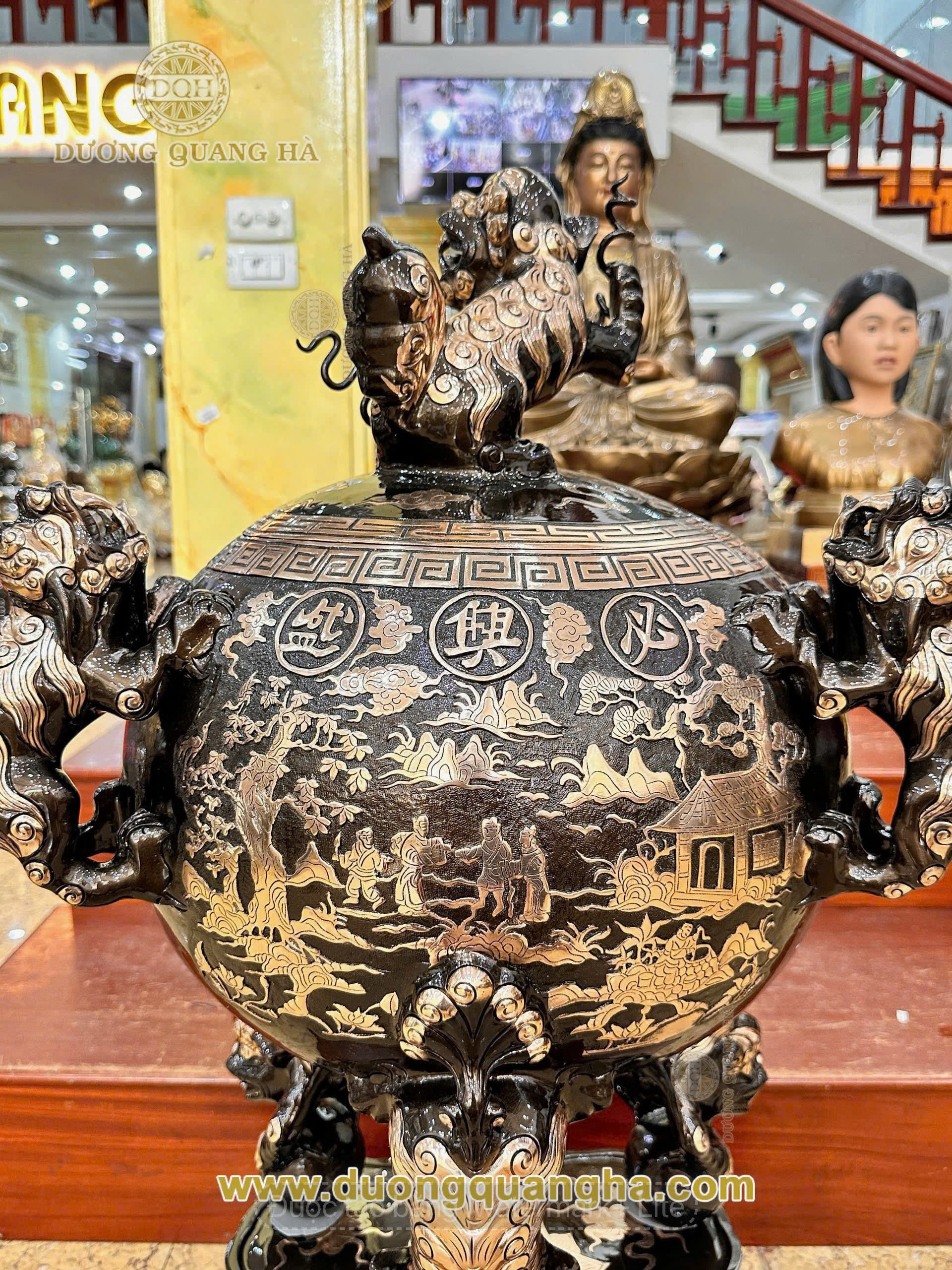 Tóm tắt về sản phẩm: Tất cả sản phẩm được đúc, gia công chế tác, chạm khảm tất cả đều được làm thủ công bằng tay mỗi sản phẩm thực sự là một tác phẩm đồng mỹ nghệ tinh xảo đến mức cao nhất, với những đường nét lưu loát, có giá trị thực sự cao của những nghệ nhân, những người thợ tài hoa từ làng nghề đúc đồng XÃ Ý YEN TTINHR NINH BÌNH